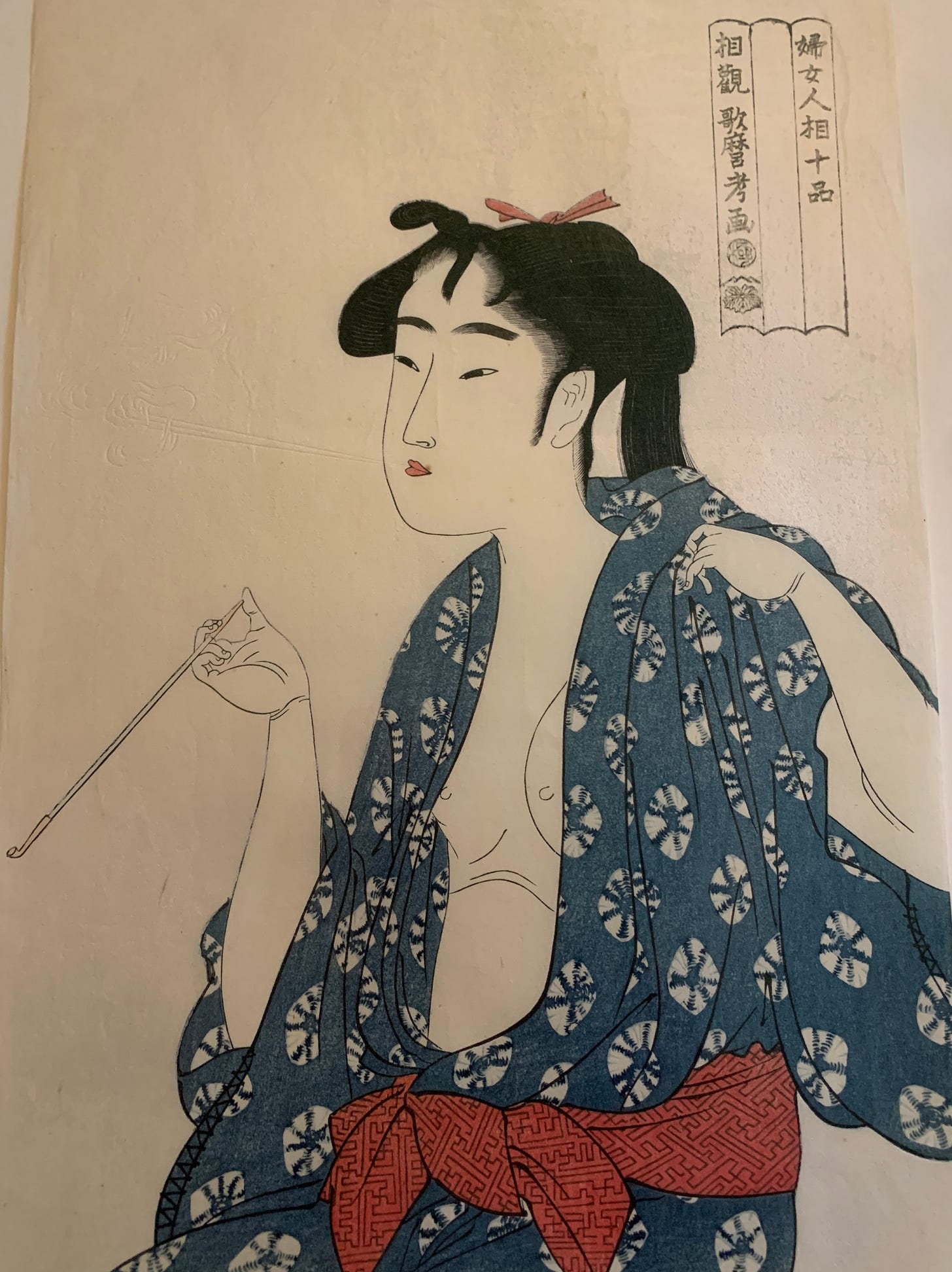 This woodblock print is Courtesan Smoking by the Japanese artist Kitagawa Utamaro from somewhere between 1755 and 1806 when he lived, probably 1790’s. It is a high-ranking courtesan or oiran, which means she would have been famous, from the pleasure quarters – an Ukiyo-e or “picture of the floating world” which typically depicted daily life and entertainment. The print is an okubi-e, a close-up portrait view of the upper body, which was a popular style at the time.